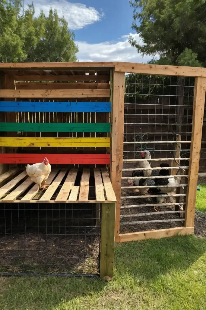Repurpose wooden pallets to create movable interior walls that divide your coop into functional zones for different activities.