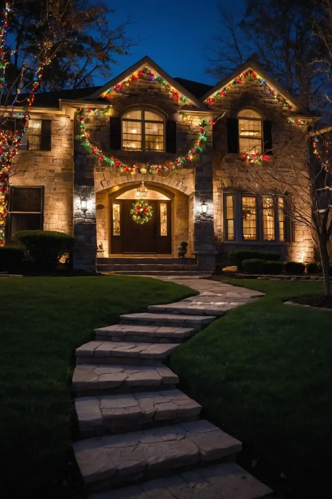 This ground-level lighting complements elevated displays on your home while adding safety benefits by illuminating pathways for visitors.