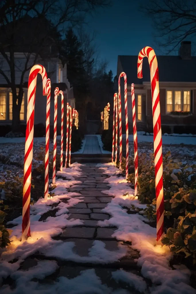 Line walkways with candy cane-shaped light fixtures created from curved PVC pipe wrapped with red and white string lights.
