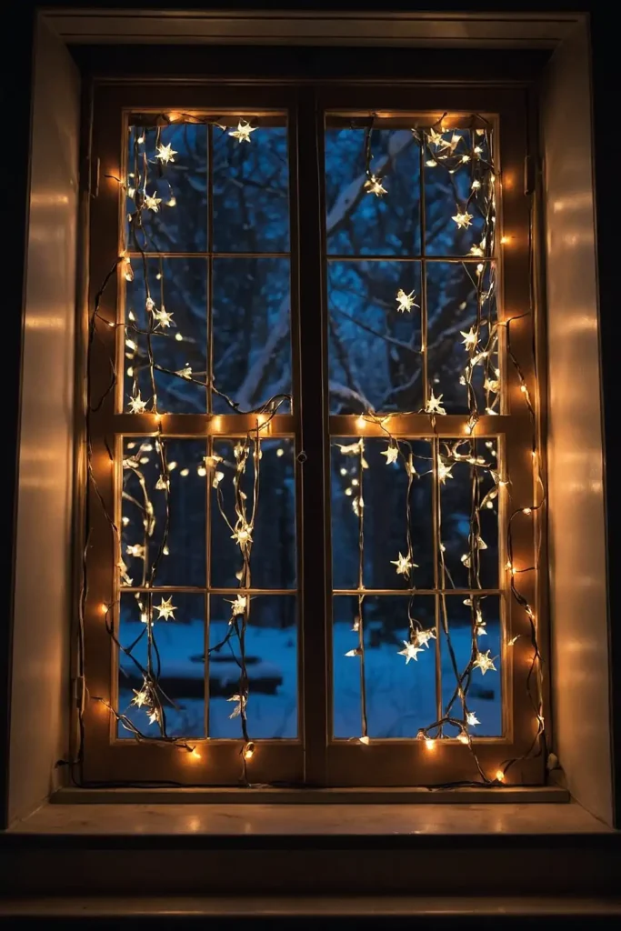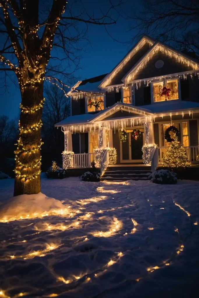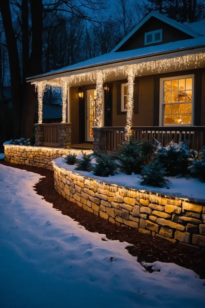 Hang icicle lights along roof edges and eaves with varying lengths to create a natural-looking frozen waterfall effect.
