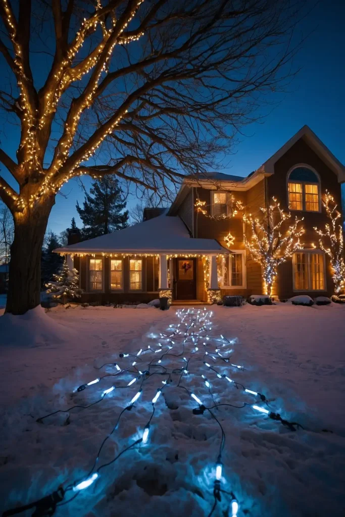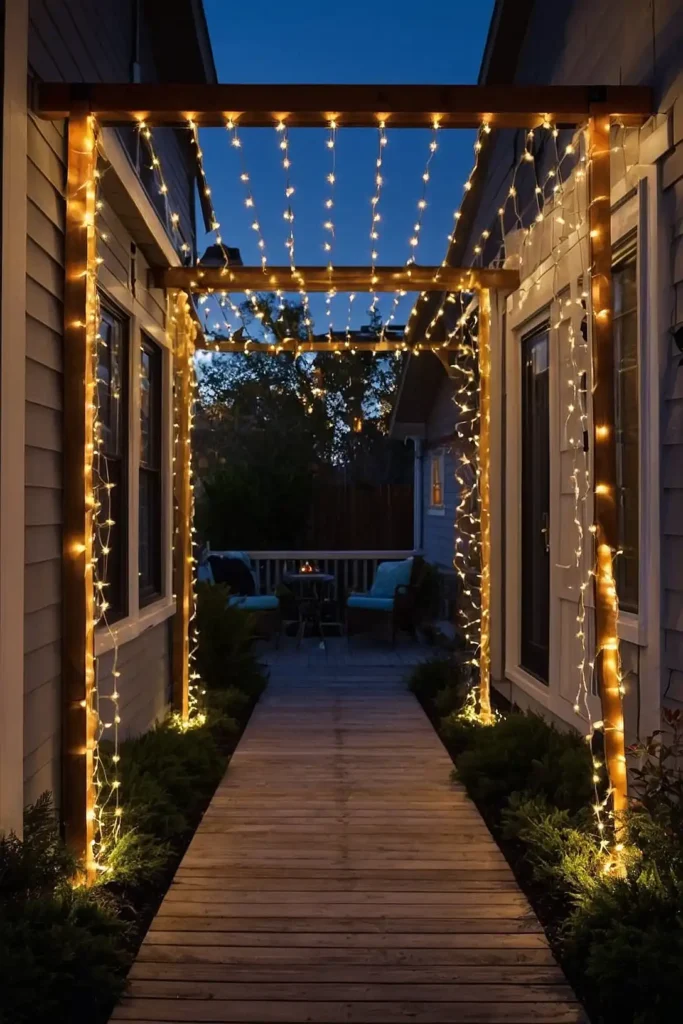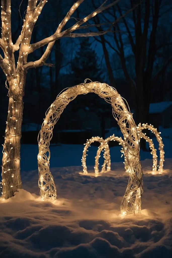 Create magical light tunnels along walkways using arch-shaped supports with icicle or curtain lights hanging downward.