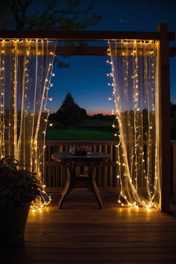 Transform existing outdoor curtains with fairy light integration, or create light curtains using vertical strands attached to horizontal supports.