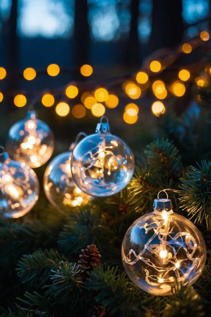 Fill large, clear plastic ornaments with battery-operated micro LED strings, then hang throughout outdoor trees and bushes.