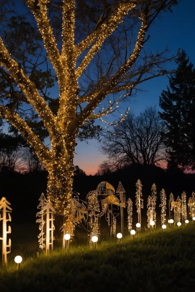 Install pre-made or custom wire frame sculptures like deer, snowmen, or sleighs wrapped with string lights.