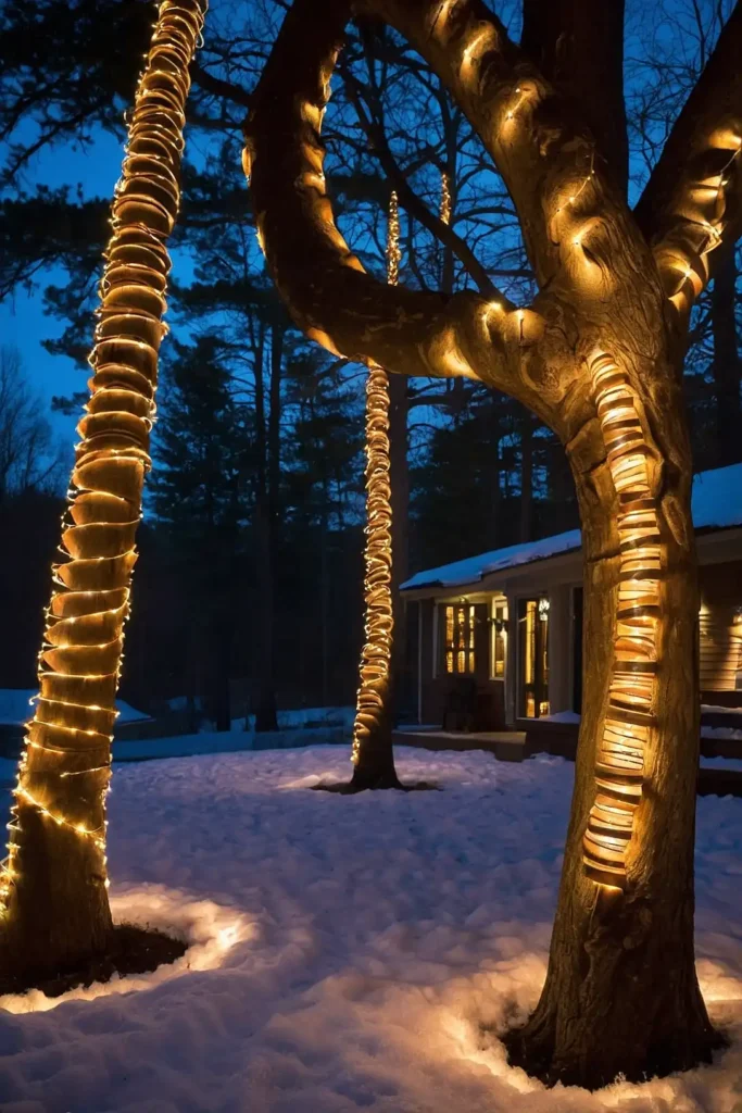 Create perfect spirals around tree trunks by maintaining consistent spacing between each light strand wrap.