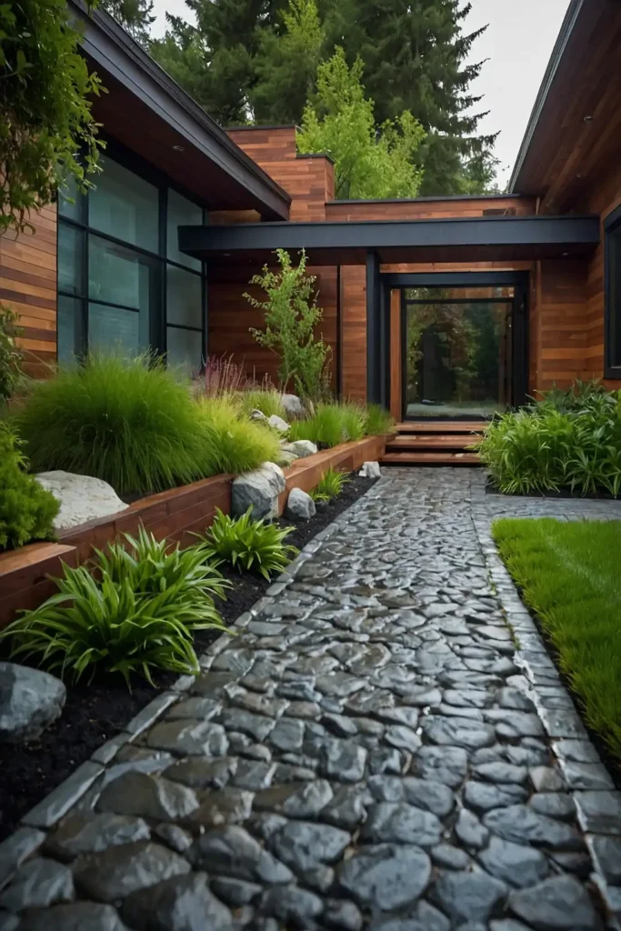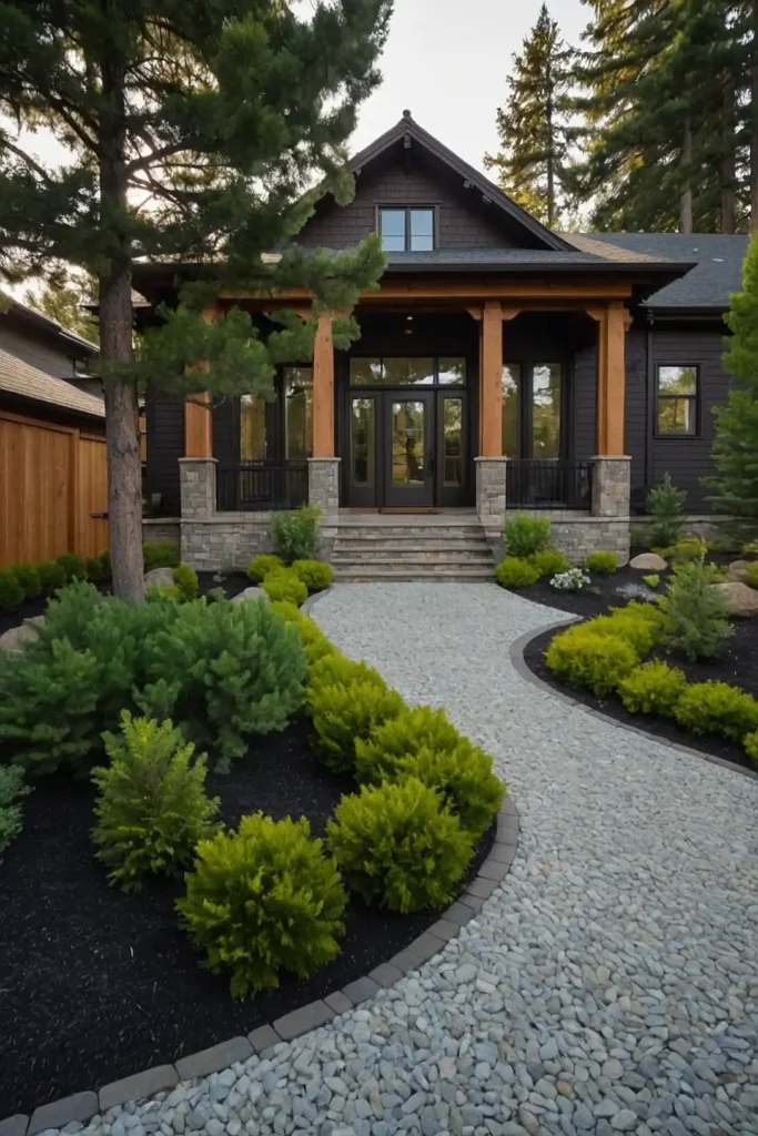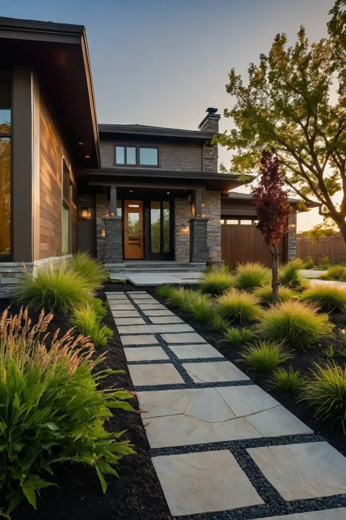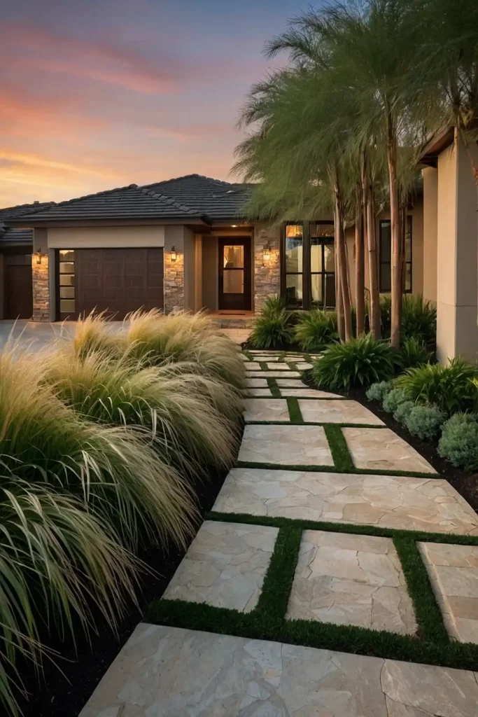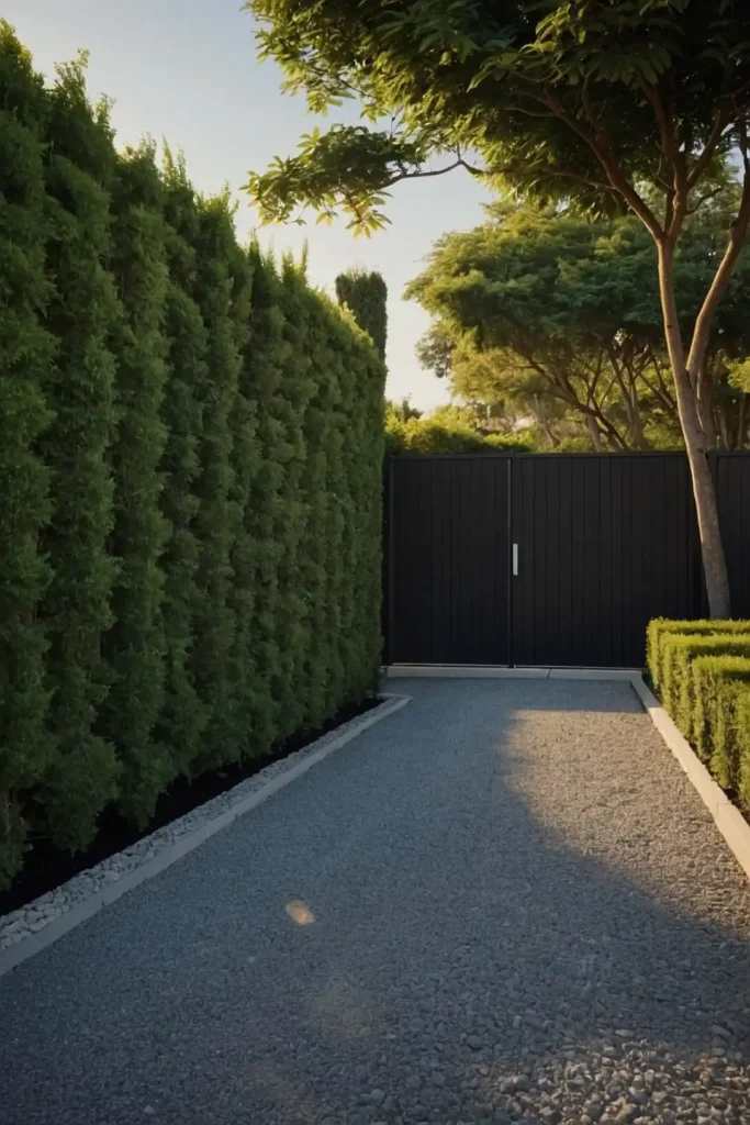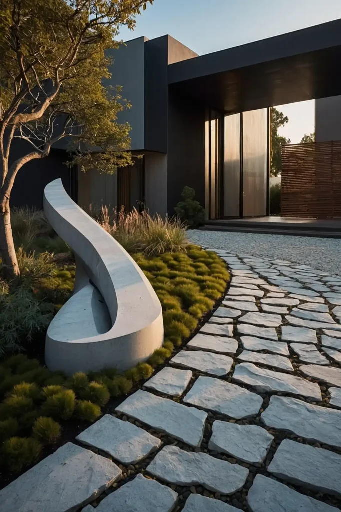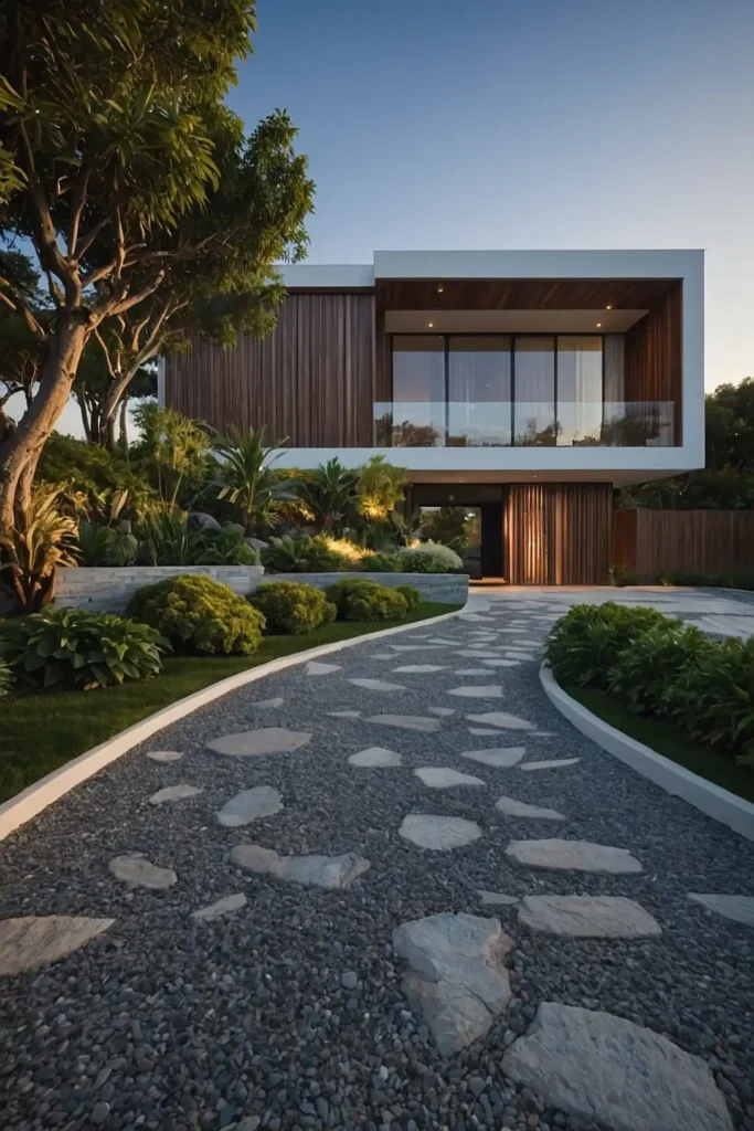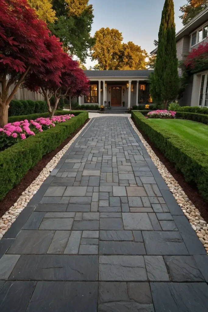 Place matching sculptural elements like stone columns, large containers, or ornamental gates at your driveway entrance to create a defined threshold and focal point.
