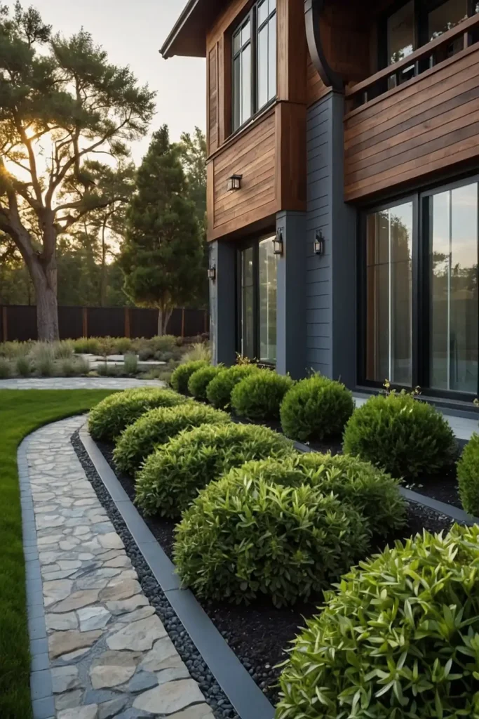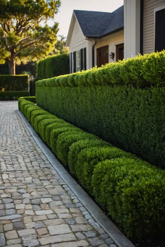 Plant a formal boxwood hedge along your driveway for a classic, structured look that remains green year-round.
