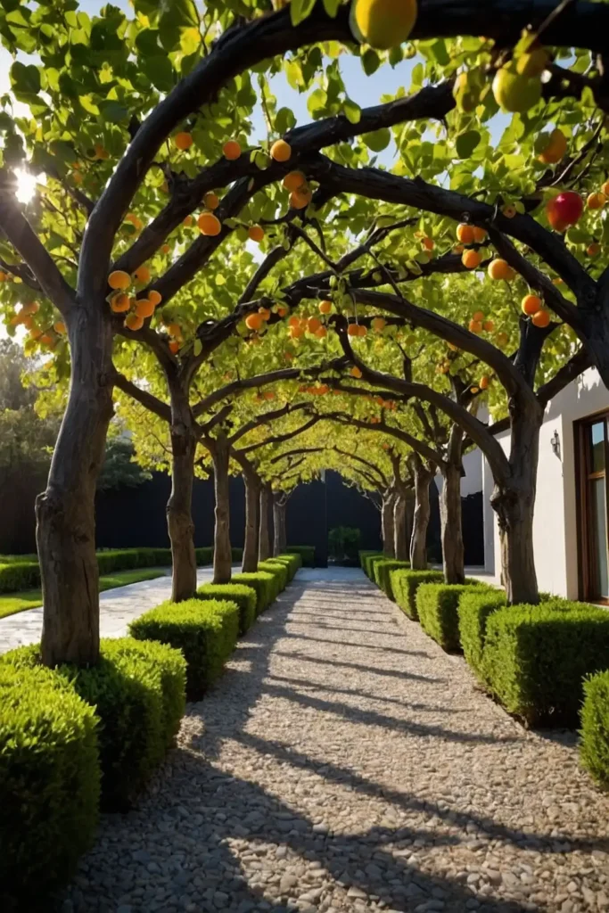 Train fruit trees flat against a wall or fence alongside your driveway using the espalier technique.