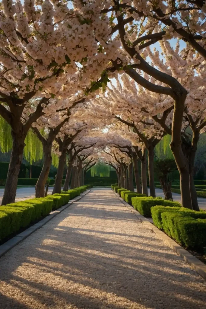 Choose trees suited to your climate—flowering cherries, crabapples, or dogwoods for spring blooms, or crape myrtles for summer flowering in warmer regions. Space them consistently for the strongest visual impact.