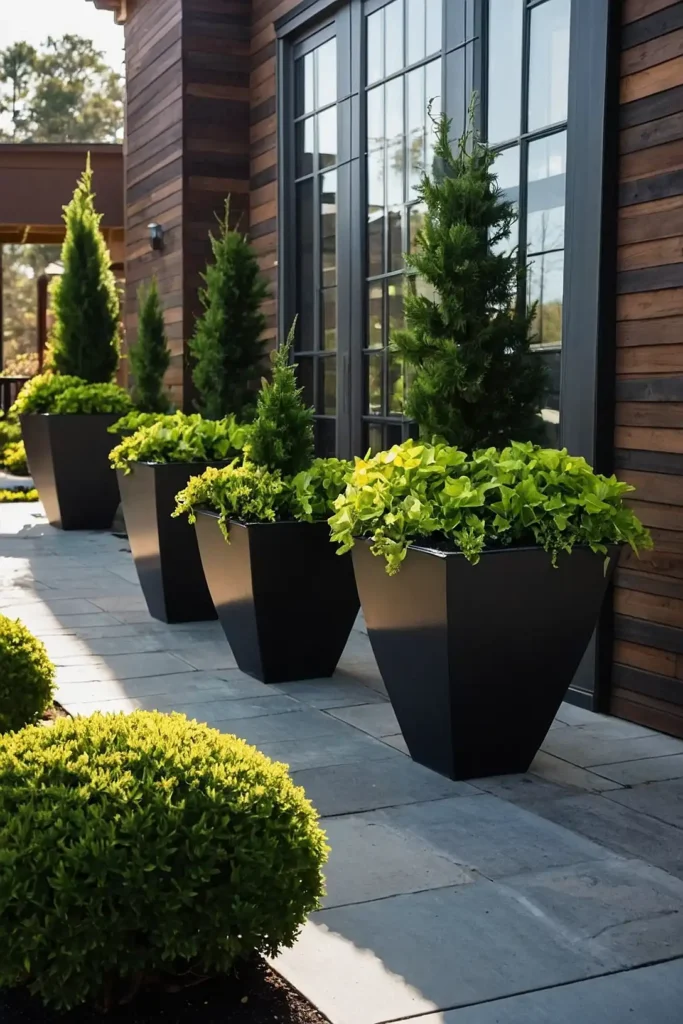 Use containers of varying heights and materials for dimensional interest. Group odd numbers (3 or 5) at key points like the entrance, curves, or near the house.