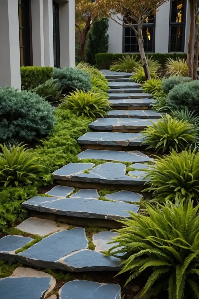 Space stepping stones at a natural walking stride length, setting them on a stable base slightly above soil level to prevent shifting or sinking over time.