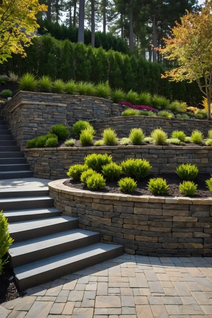 Install adequate drainage behind walls and choose stones or blocks specifically designed for retaining wall construction to ensure long-term stability.