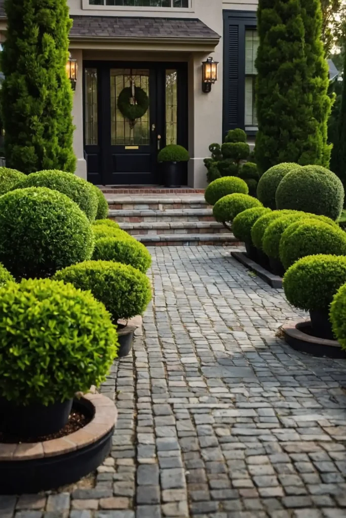Place formally pruned topiary specimens at key points along your driveway to add architectural elements and year-round structure.