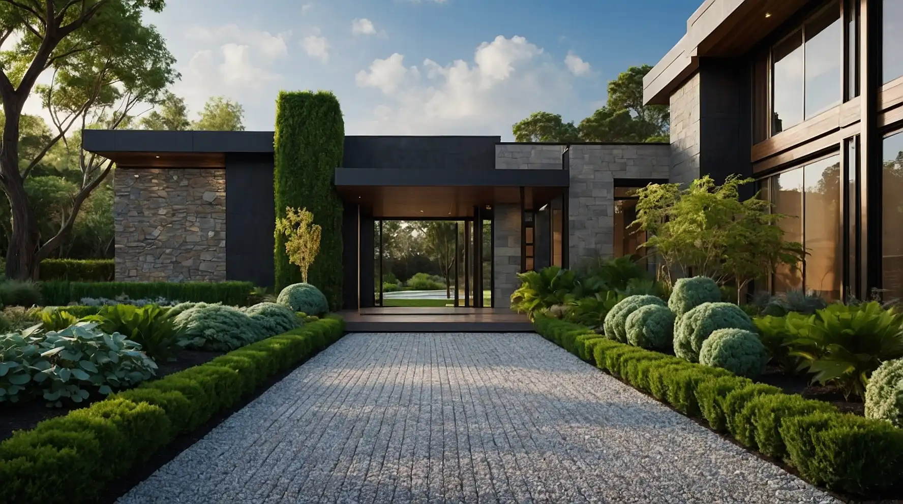 Place matching sculptural elements like stone columns, large containers, or ornamental gates at your driveway entrance to create a defined threshold and focal point.