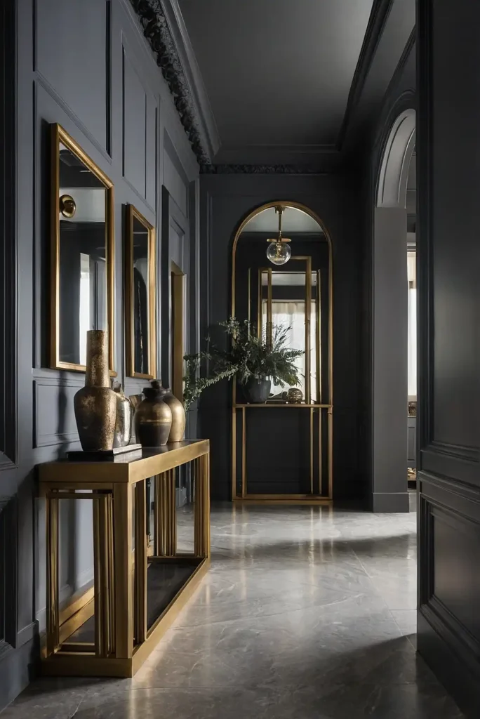 Expand your hallway visually by incorporating mirrors against gray walls.
