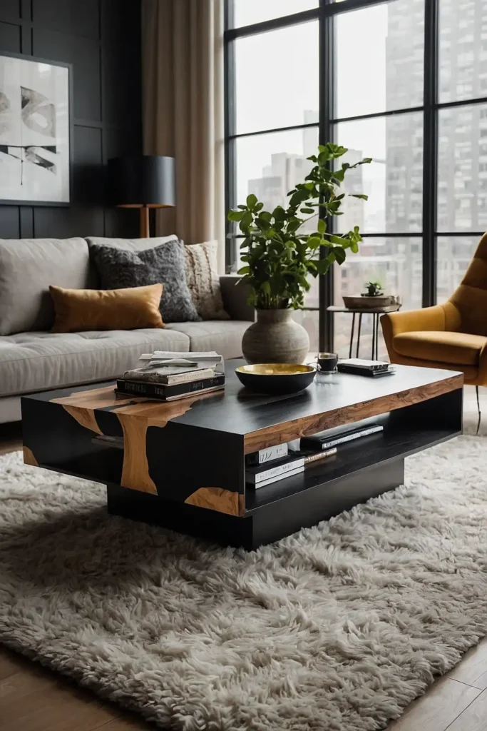 Select a coffee table that combines different materials—glass with metal, wood with concrete, or marble with brass accents.