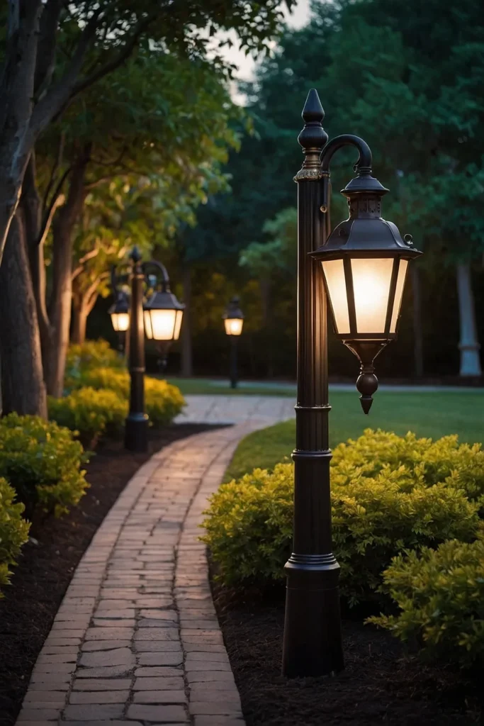 Install vintage-inspired lamp posts at key points along your primary walkways for classic, timeless appeal.