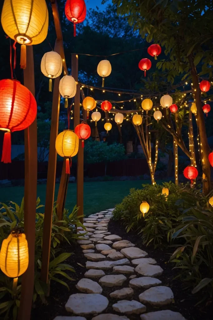 Hang colorful paper lanterns containing LED lights along garden pathways for festive, bohemian charm.
