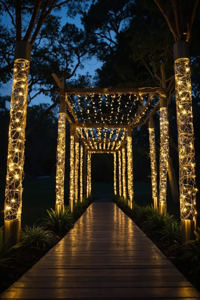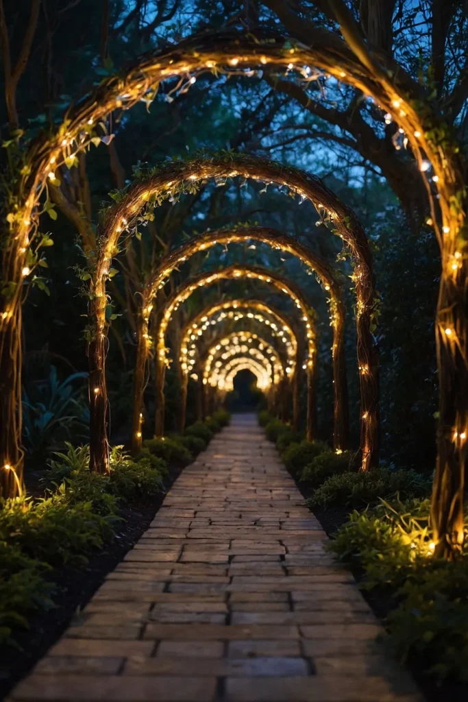 Create magical light tunnels by stringing delicate fairy lights through archways or overhanging branches above your path.