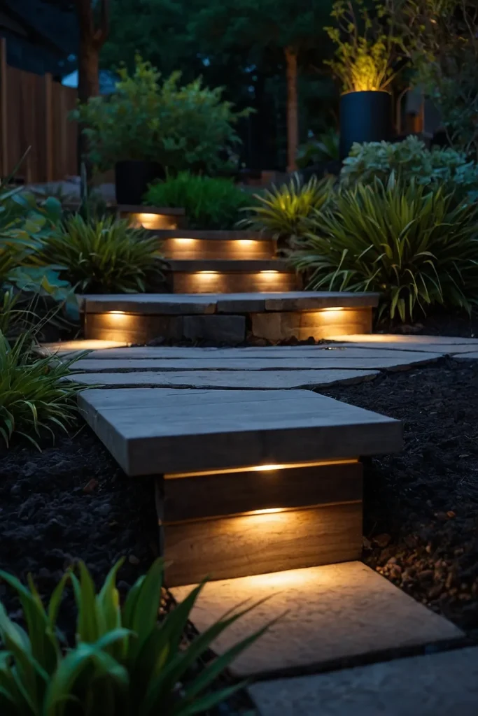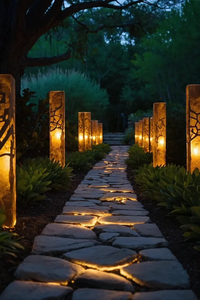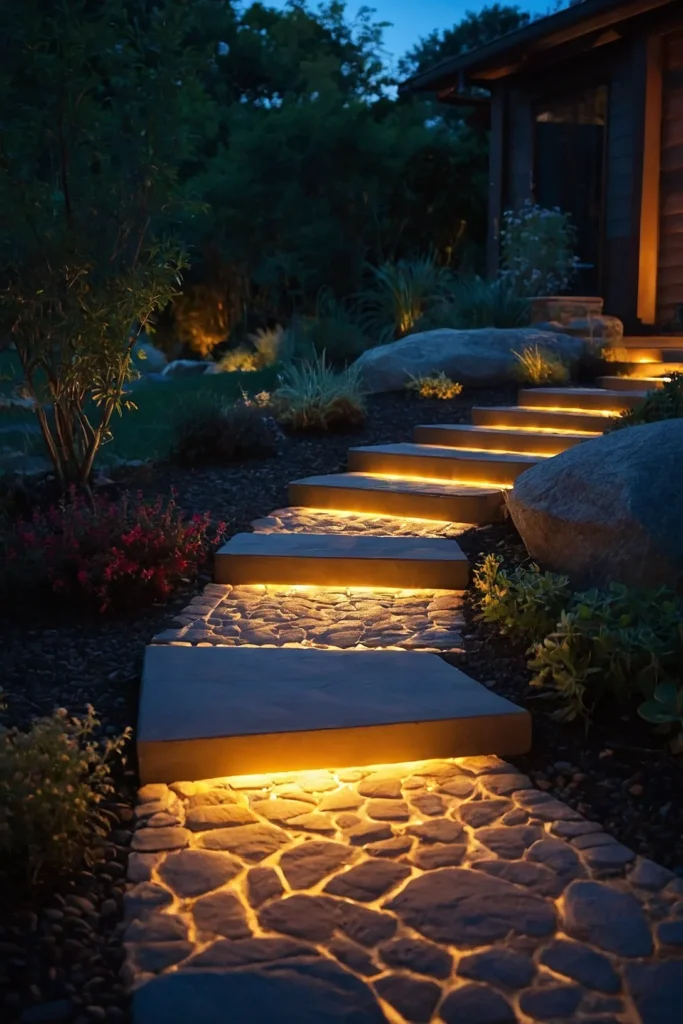 Incorporate lighting elements within stacked stone pillars or retaining walls along your pathway.