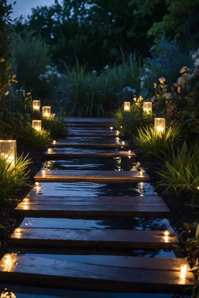 Illuminate pathways alongside water features with floating lights that create reflected brilliance.