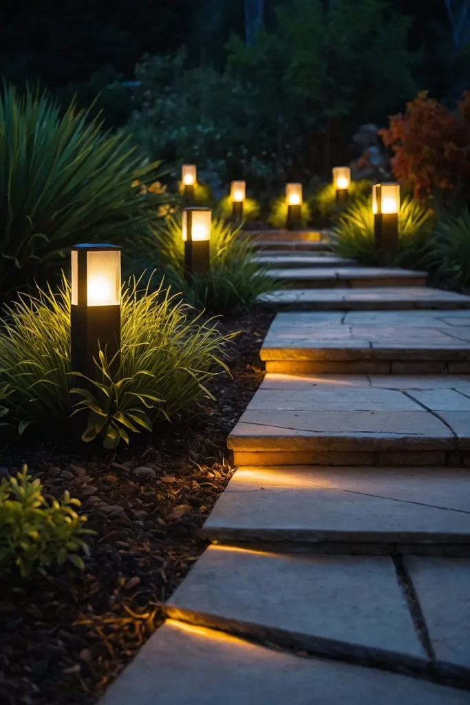 Install contemporary bollard lights along wider paths or entryways for architectural impact.