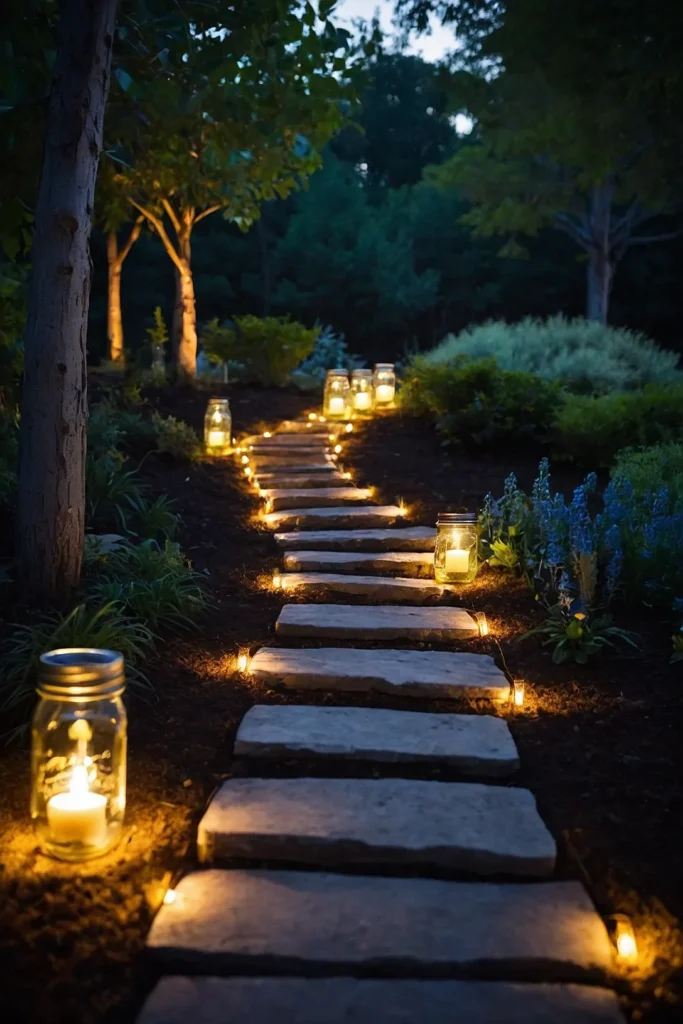 Hang homemade mason jar lights from shepherd’s hooks along your pathway for charming rustic appeal.