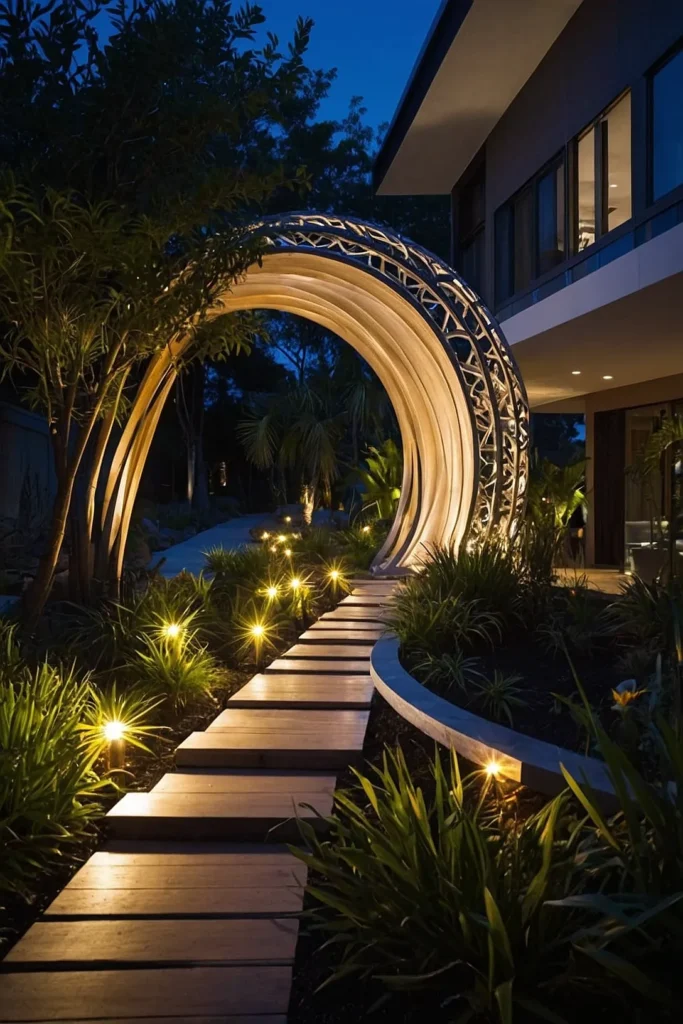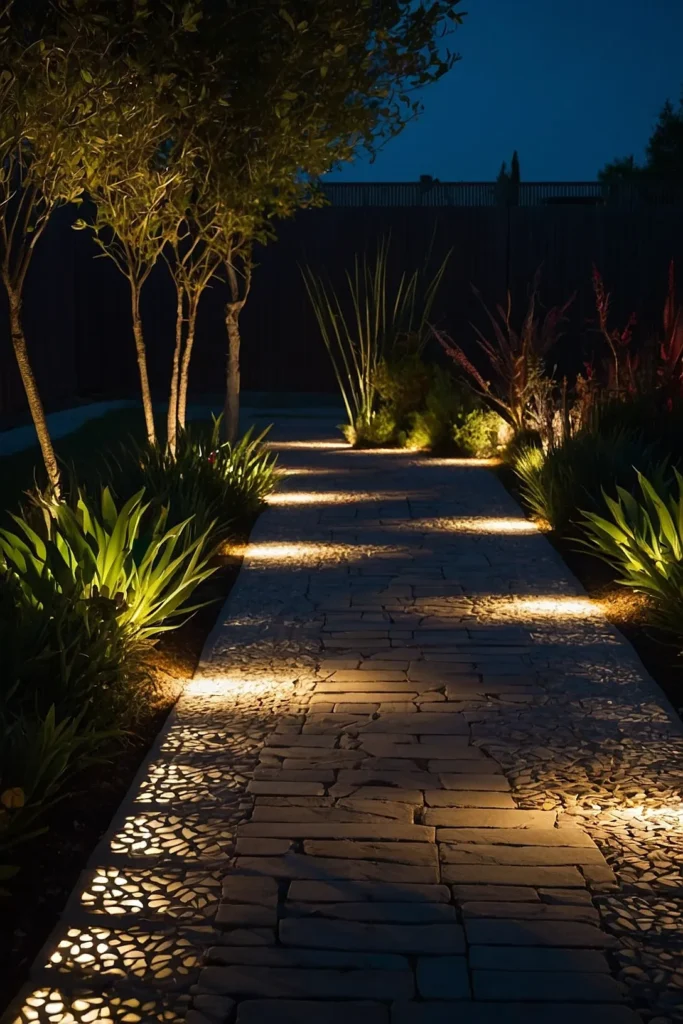 Install fixtures that cast intricate shadow patterns on your pathway surface for artistic illumination.