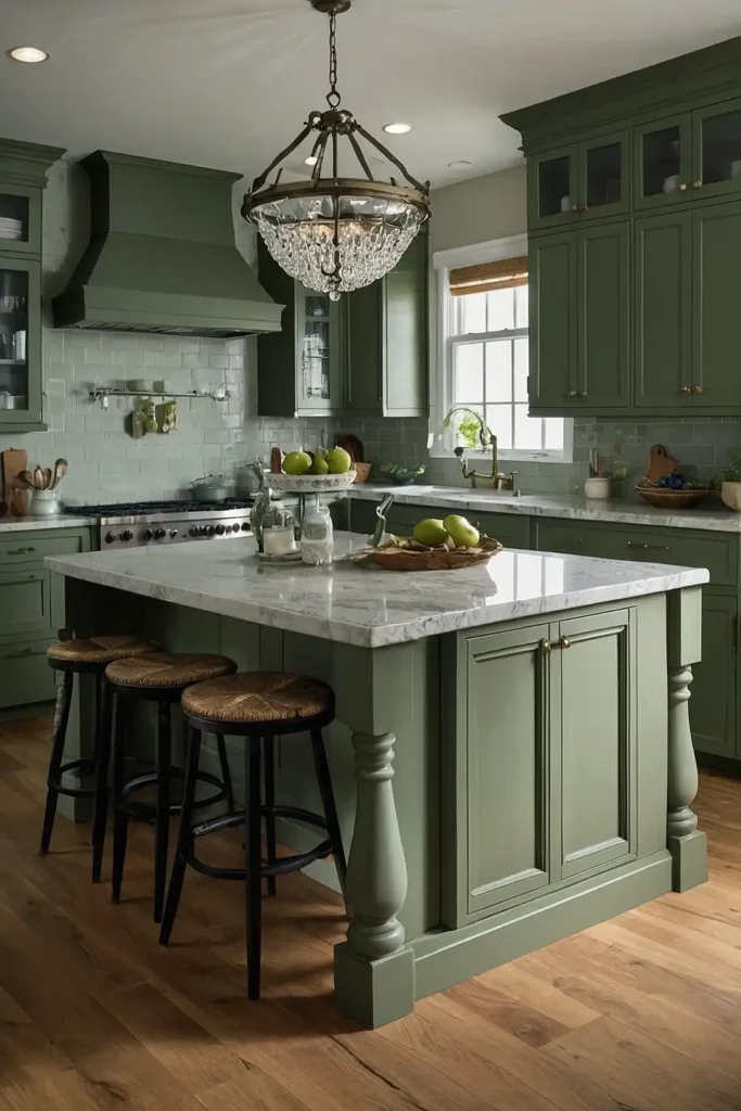 The island becomes a furniture-like centerpiece in your kitchen. Choose a slightly darker sage tone for the island to create subtle hierarchy within the space.