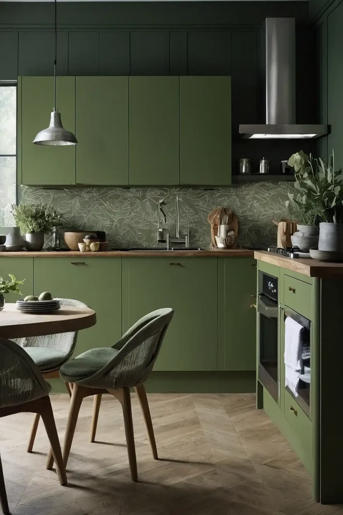 Transform your kitchen with full sage green cabinetry for a bold yet soothing statement.