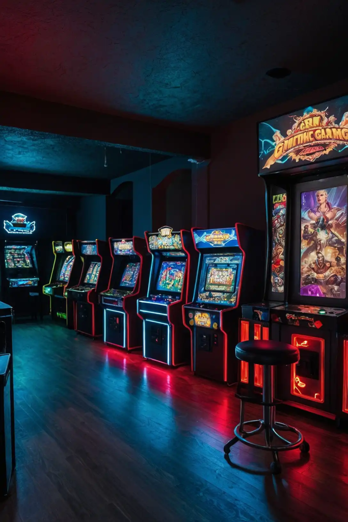 Add dramatic lighting with LED strips or neon signs to create an authentic arcade atmosphere.