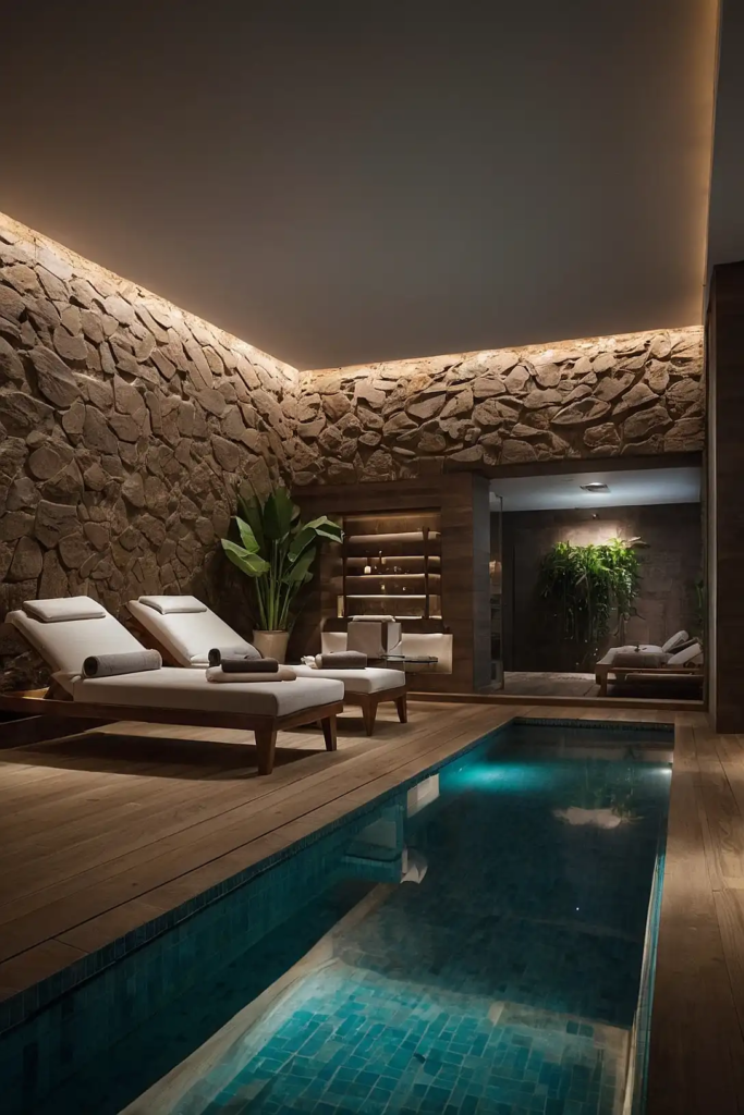 Incorporate traditional elements like stone or brick with modern lighting to create an atmosphere that balances old-world charm with contemporary comfort.